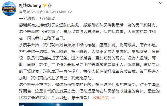 杜锋在4月17日深夜发文,他感谢了支持广东男篮的球迷们、球员和所有人,同时坦言球队确实遇到了很大的困难,疲劳加剧、伤病频发、磨合不足等等,但所有人都选择了坚持,同时还致敬易建联、周鹏和任骏飞这些老将,称三战辽篮,收获是巨大的,虽然无缘总决赛,但全队都是胜利者,因为都击败了自己。杜锋还表示整体竞争格局的升级,对于中国篮球来说也是好事。