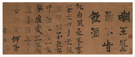 《嘲王历阳不肯饮酒帖》整幅纵26.4厘米,横67厘米,全帖共50字,包含了《嘲王历阳不肯饮酒》全诗,落款为“李白”。该帖书写自然流畅,气韵生动,用笔拙朴挺拔,笔力遒劲、洒脱,观察文字的墨迹笔风可以看出,书写用笔是唐代特有的有心硬笔(鸡距笔);而所用纸张为唐宋时期出产于四川的麻纸,由于传世经年,整体色泽发黄黑,纸面折痕看出纸质偏脆、纤维较细,作品整体纸色醇古、书风刚健、气势遒迈,流露出浓郁的豪放粗犷之气。