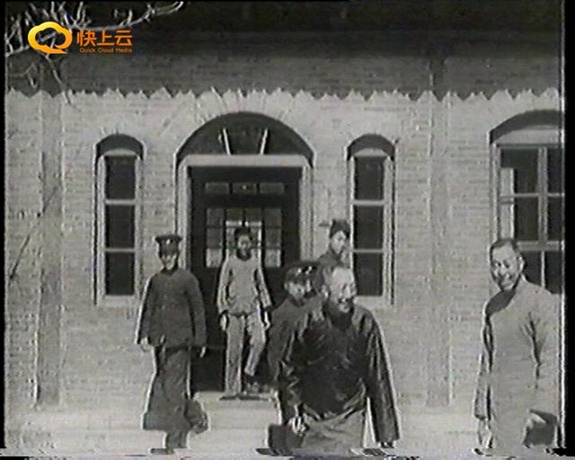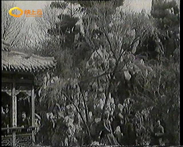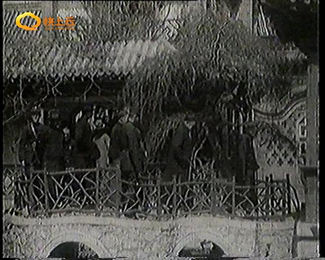 在十笏园内一行人陆续走到四照亭站定,赏水观景。四照亭牌匾上的“浣云”二字隐约可见,亭柱上的对联是晋代大诗人陶渊明的诗句:“望云惭高鸟,临水愧游鱼”。十笏园原为明嘉靖年间潍县显宦胡邦佐的故宅,1885年潍县首富丁善宝以重金购得,修湖筑山,更名为“十笏园”。这座园林兼具中国南北园林建筑风格,为北国园林之最。为了表现十笏园的绝佳景色和受赏程度,在《潍县大观》中安排了部分军政官员、商绅名士游园的多组镜头。