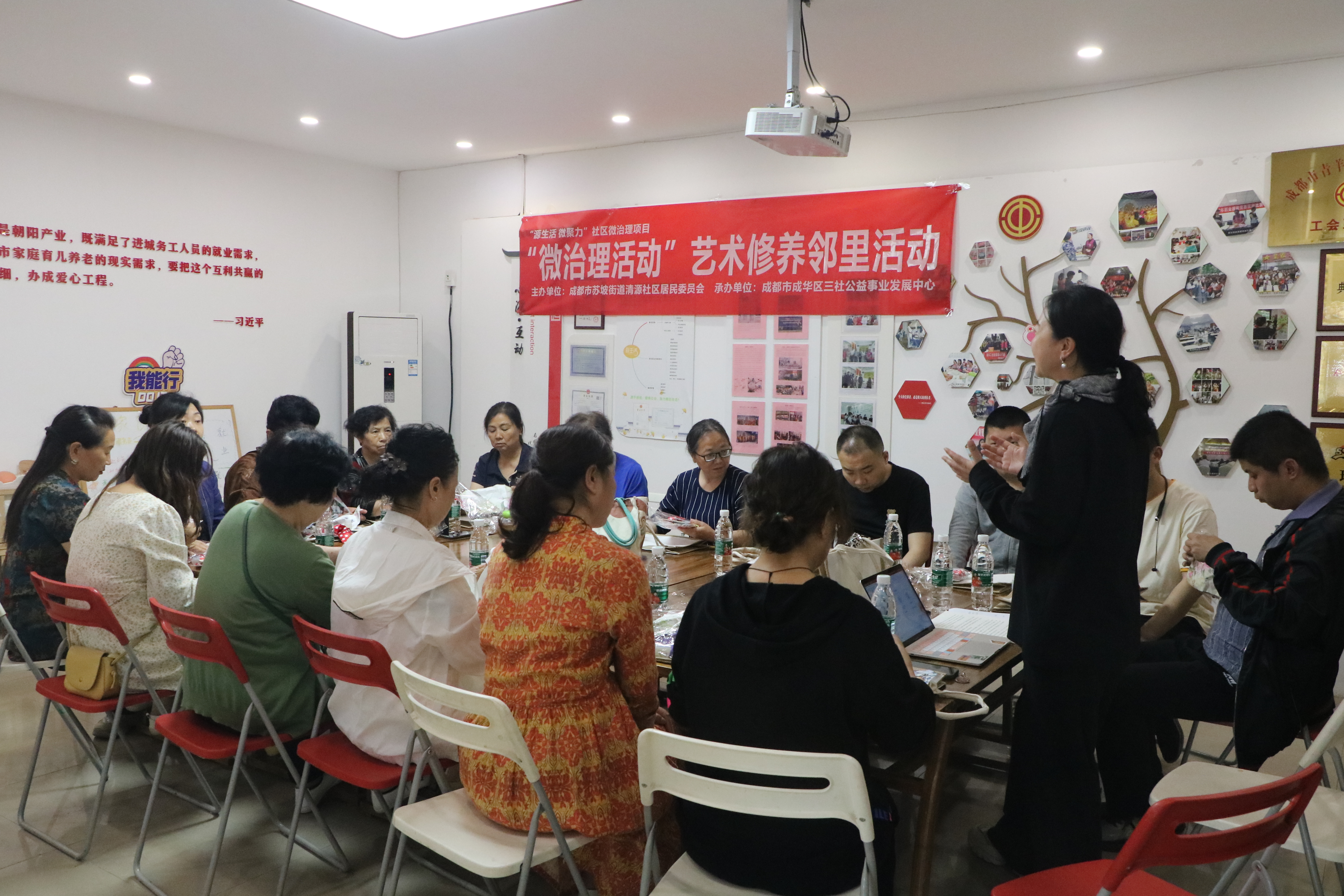 为进一步满足辖区内居民的多样化需求,丰富居民的精神文娱生活,提高其幸福指数和效能感,增强社区凝聚力,提高居民的生活品质,结合生活美学的理念。2024年4月17日下午由清源社区居民委员会主办,成都市成华区三社公益事业发展中心承办的“微治理活动”艺术修养邻里活动在清源社区开展,共计30余人参与。