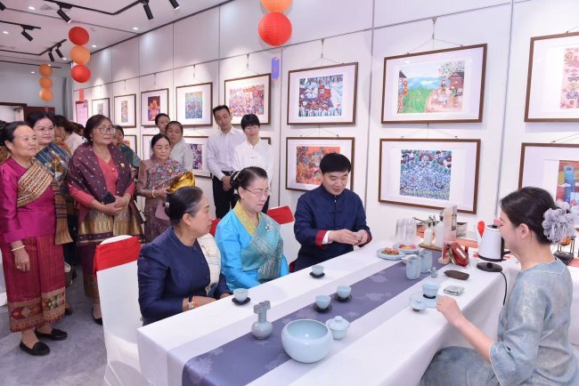 “瓷茶丝路”主题展陈区域,非物质文化遗产南宋官窑烧制技艺代表性传承人金鑫带来的龙泉青瓷作品光华尽显;茶文化体验区不仅系统介绍中国六大茶类的起源与特性,更创新推出新式茶饮试饮,吸引众多老挝年轻人驻足品味、拍照分享。国潮体验区则成为当地年轻群体的打卡胜地,戏曲人物绘画、速写肖像、漫画祝“福”、汉服体验等互动项目,让当地年轻人在笔墨丹青与传统服饰的体验中,感受中国传统美学的独特魅力。