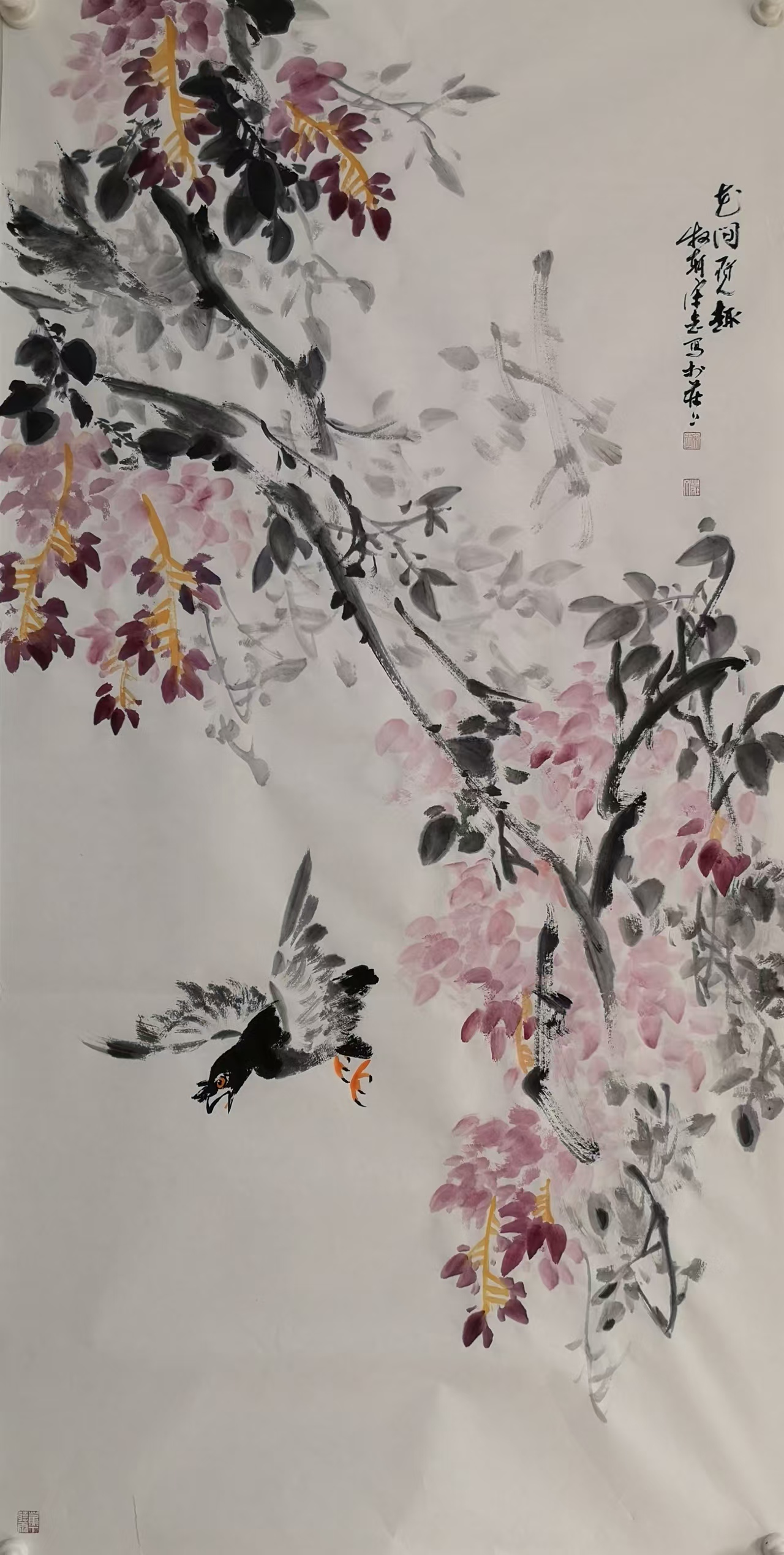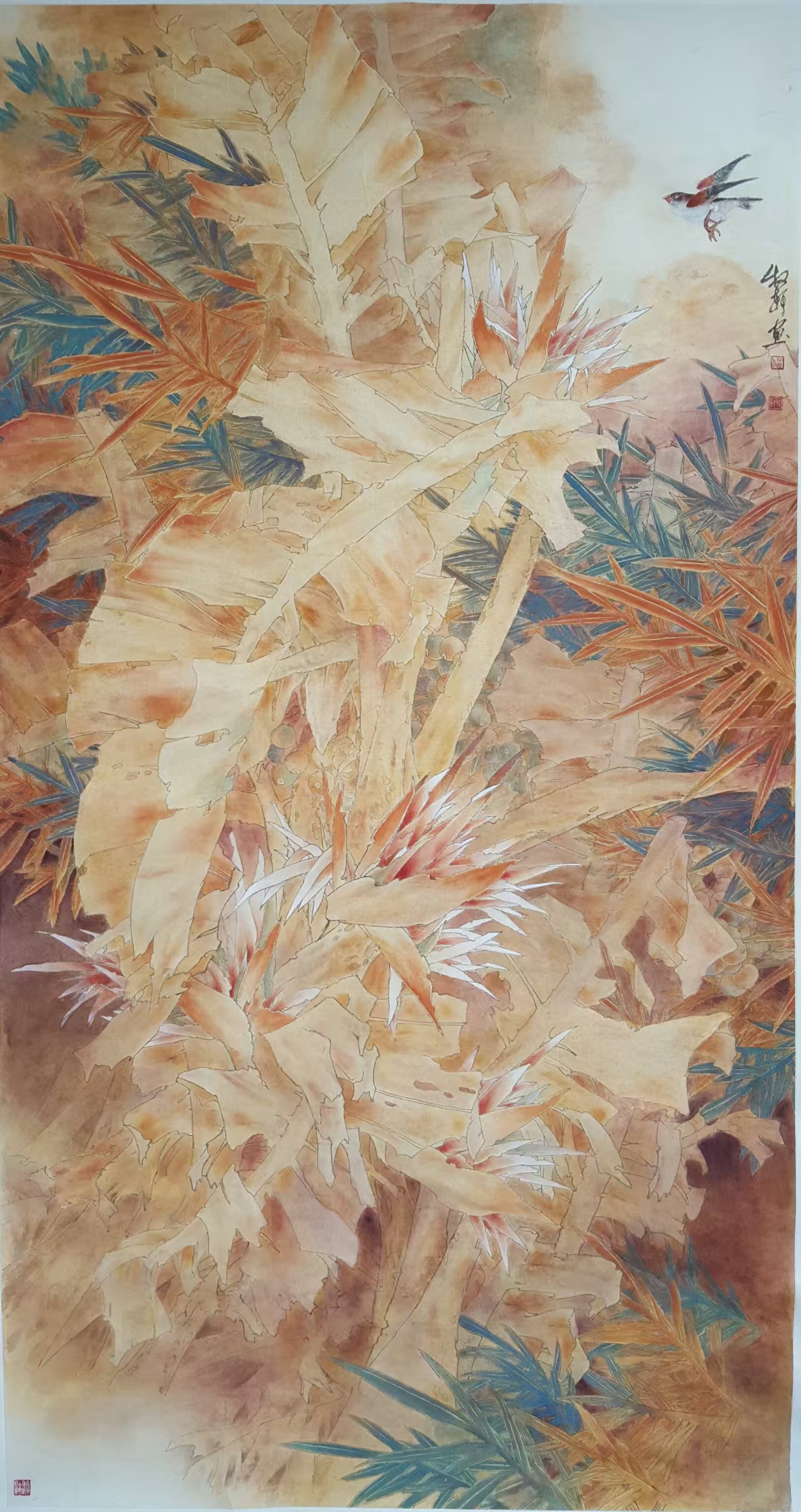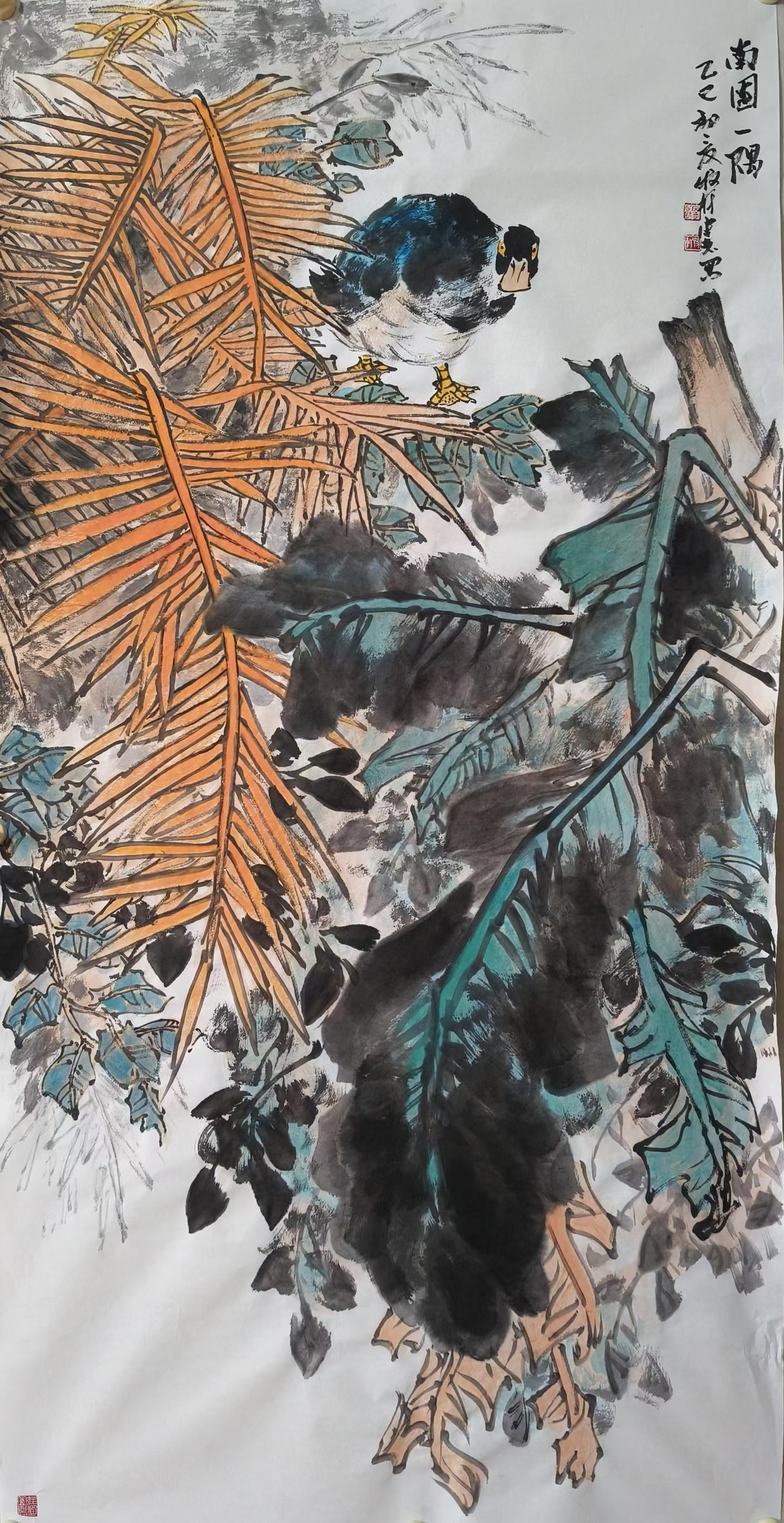 我的面前,展现着一幅画。画面上,绚烂的野花,穿插的枝叶,沉稳的石头,灵动的八哥,组成了一幅完整的作品。这是一张热带雨林题材的小写意花鸟画。在作画技法上,作品又映带出几分用笔恣肆、奔放淋漓的大写意气象。作者通过这种勾勒与点染结合,浓墨与淡彩兼之的技法,很好的表现出雨林春日生机勃勃又清新隽永的画面主题。这幅作品的作者是宋志,创作于在云南西双版纳写生期间。宋志先生每年春节后都要去西双版纳写生,每次写生一个多月,十年不辍。这张作品,呈现了他近十多年来潜心研究、默默耕耘的劳动心血。