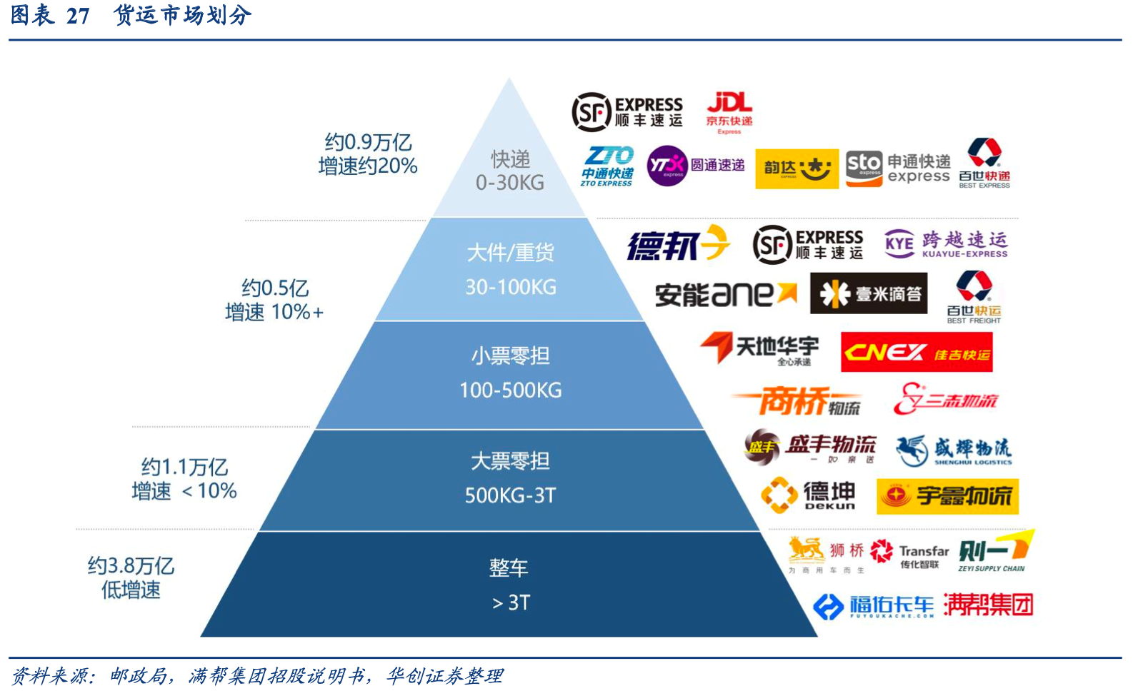 顺丰、快狗、货拉拉等我们熟知的公司属于快递、快运一类,而体量最大的整车物流行业才是属于满帮集团的赛道。