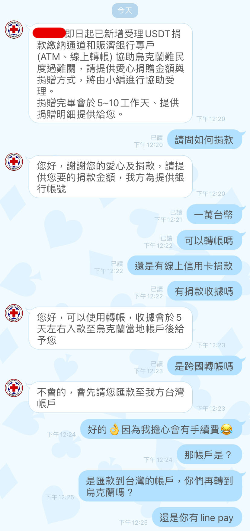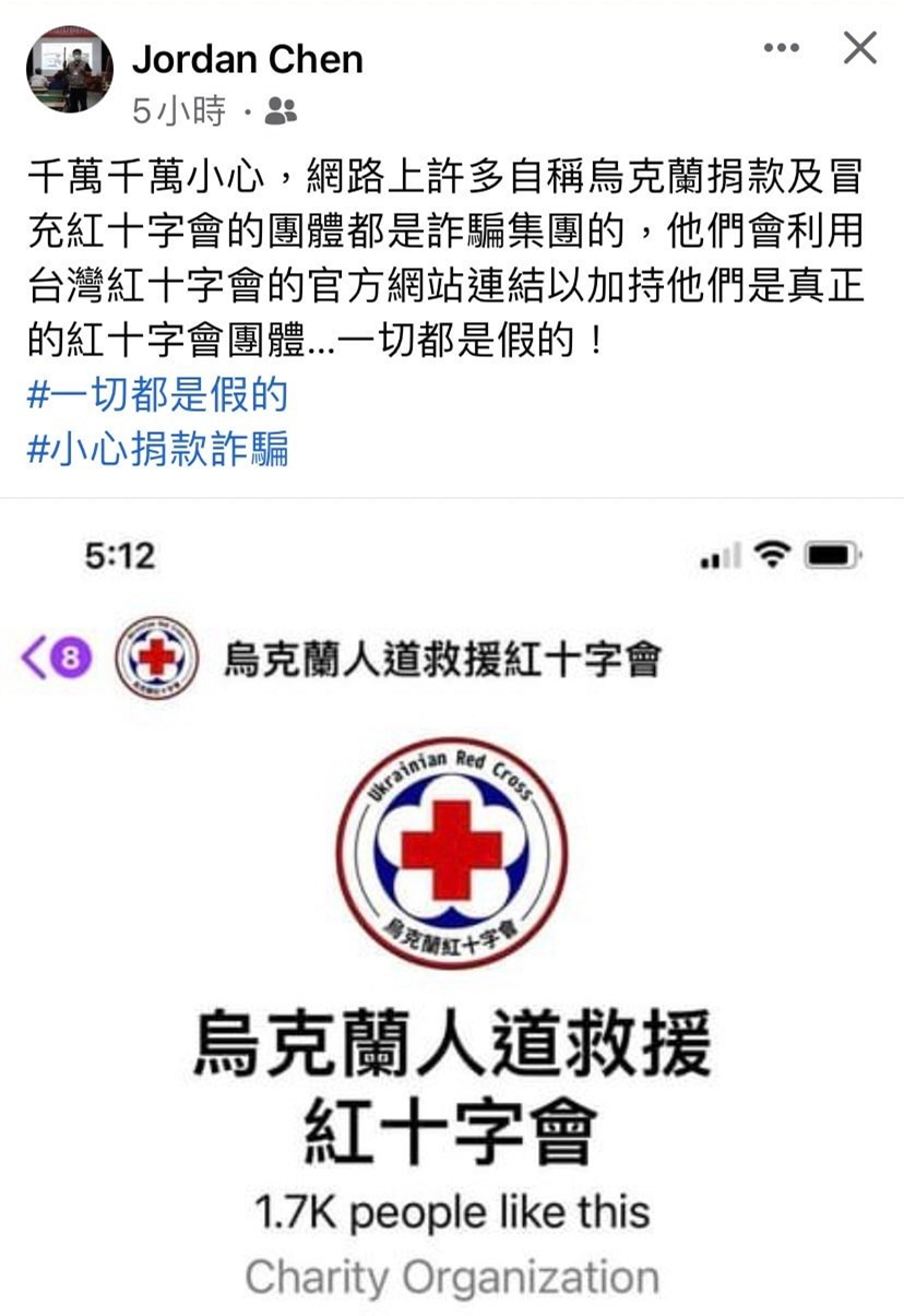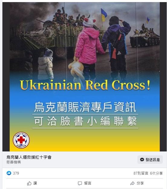 3月18日,台湾红十字会发文称,该会日前在脸书上发现有诈骗集团冒用“乌克兰人道救援红十字会”名义对外公开募款,要求有意捐款的岛内网民私信该“赈济专户资讯”的小编,并要求民众在聊天软件添加该账户小编为好友。