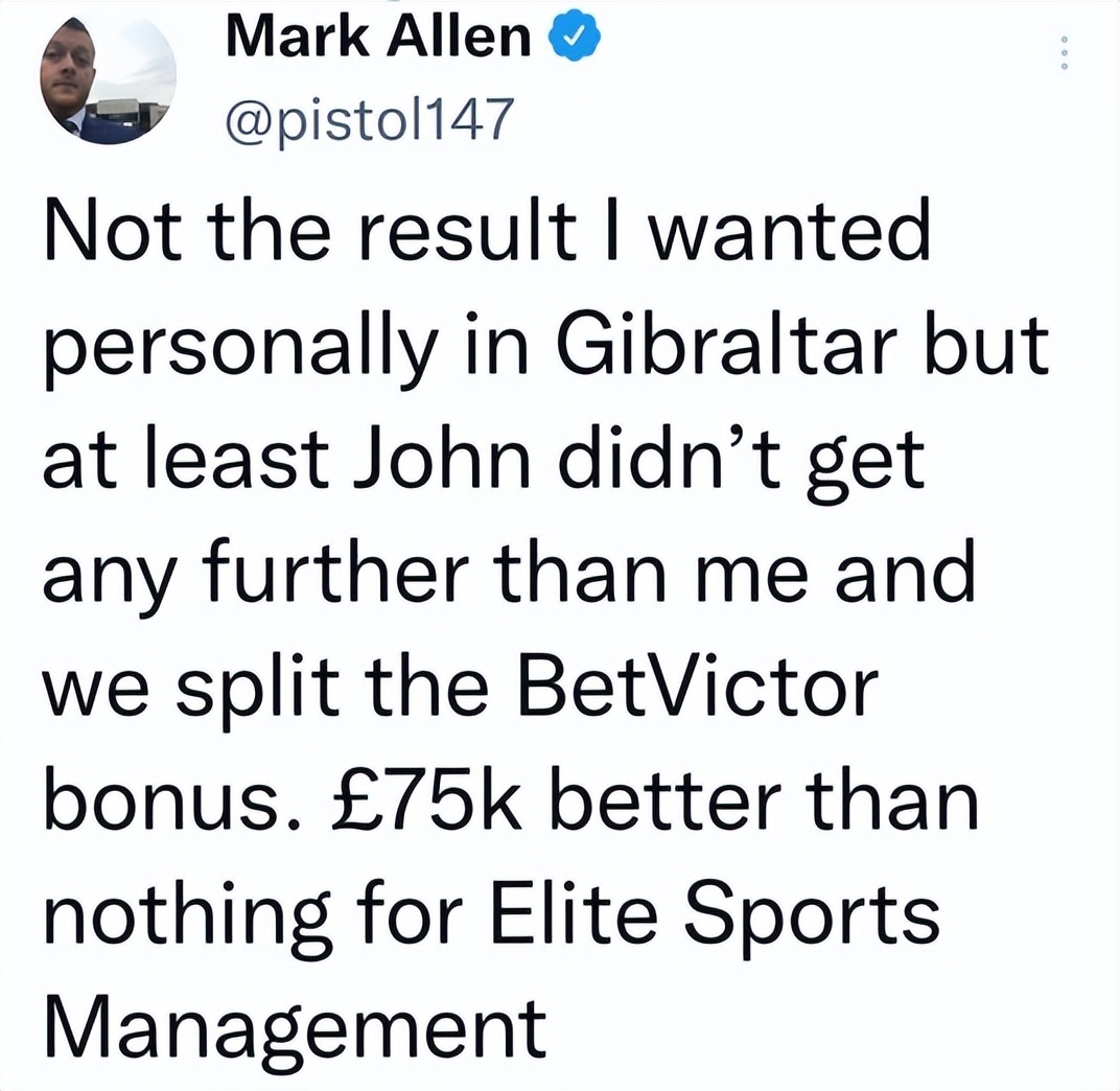 “欧洲系列赛”奖金榜,马克·艾伦和希金斯都是拿到10.1万英镑,并列第1,马克·艾伦第一时间发声,“希金斯没有比我更进一步,我们平分了额外奖金。”