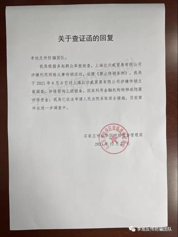 裕华区市场监督管理局:从目前的调查来判断,这个传销组织属于一种经营性传销行为,经营性的传销目前来看还不足以构成诈骗型的传销。如果随着案件的进一步调查,如果他