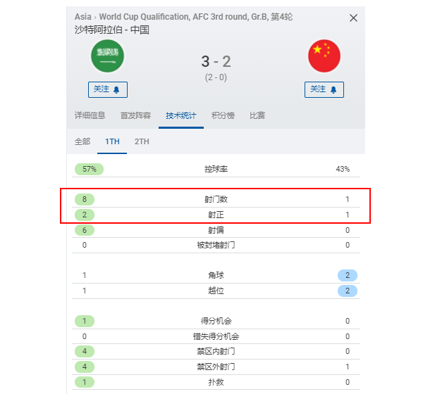 毕竟上一次交锋,类似的532阵型下,池忠国、金敬道和吴曦的三中场劣势明显,沙特队半场射门数8-1领先,比分是2-0。