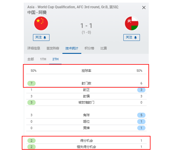 从上次交锋情况看,国足下半场面对阿曼队时稍稍占优的。球队创造出的射门数和绝对得分机会,略多于对手。