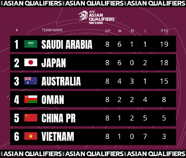 从积分表的形式看,沙特队领先澳大利亚队4分,同时日本队将会与澳大利亚队先战一场。如果日本队赢下比赛,沙特队将会提前2轮晋级。