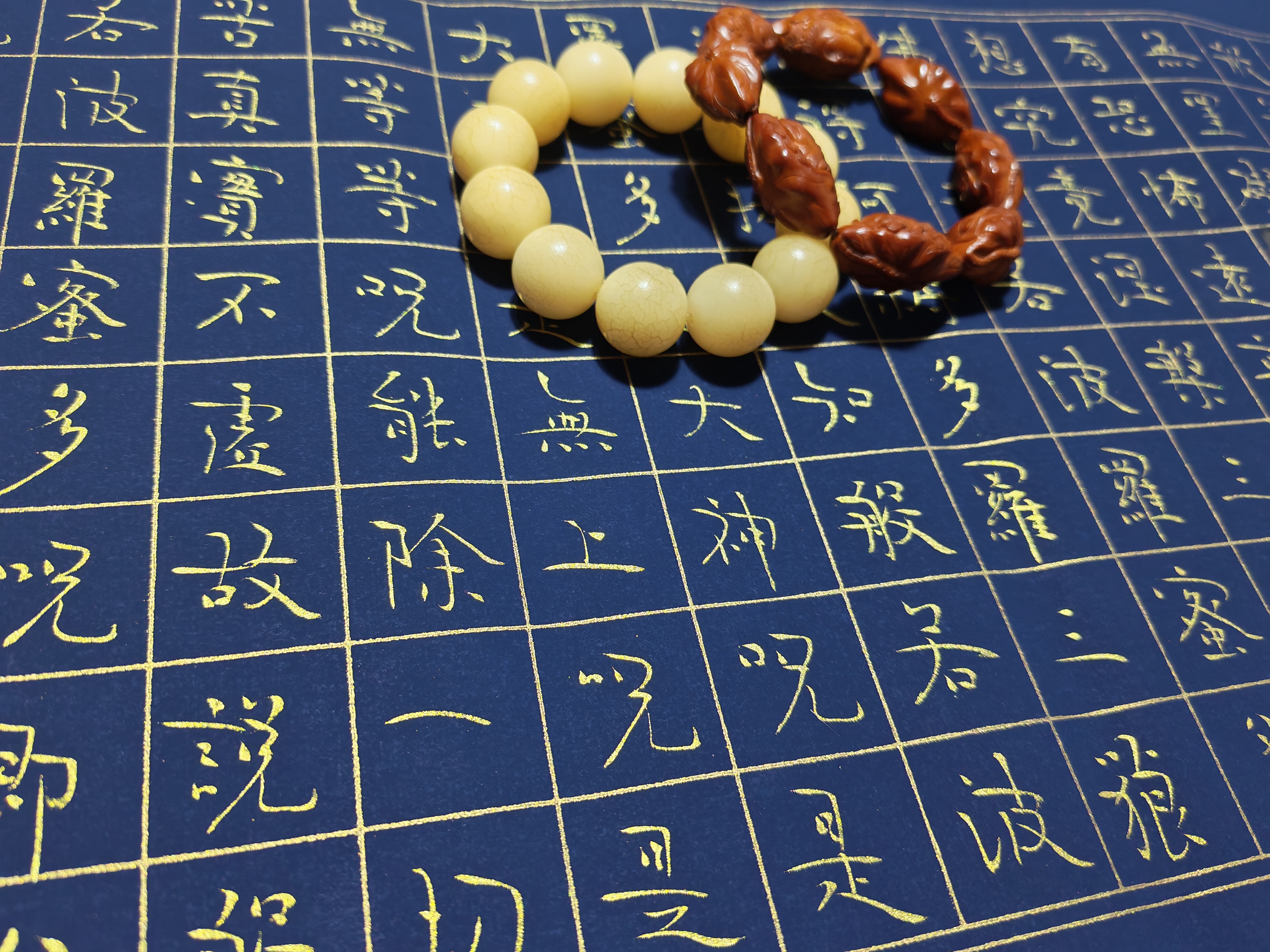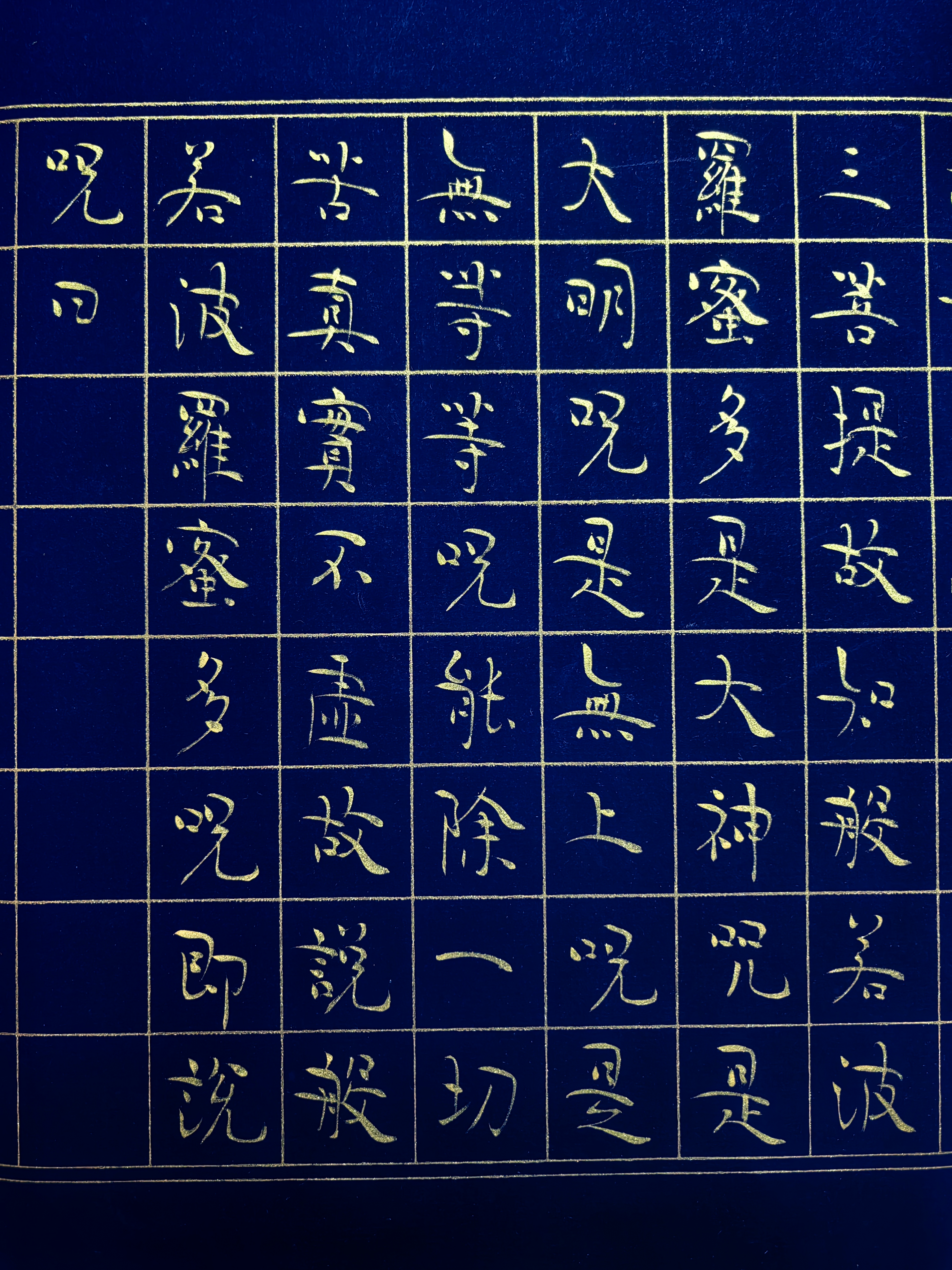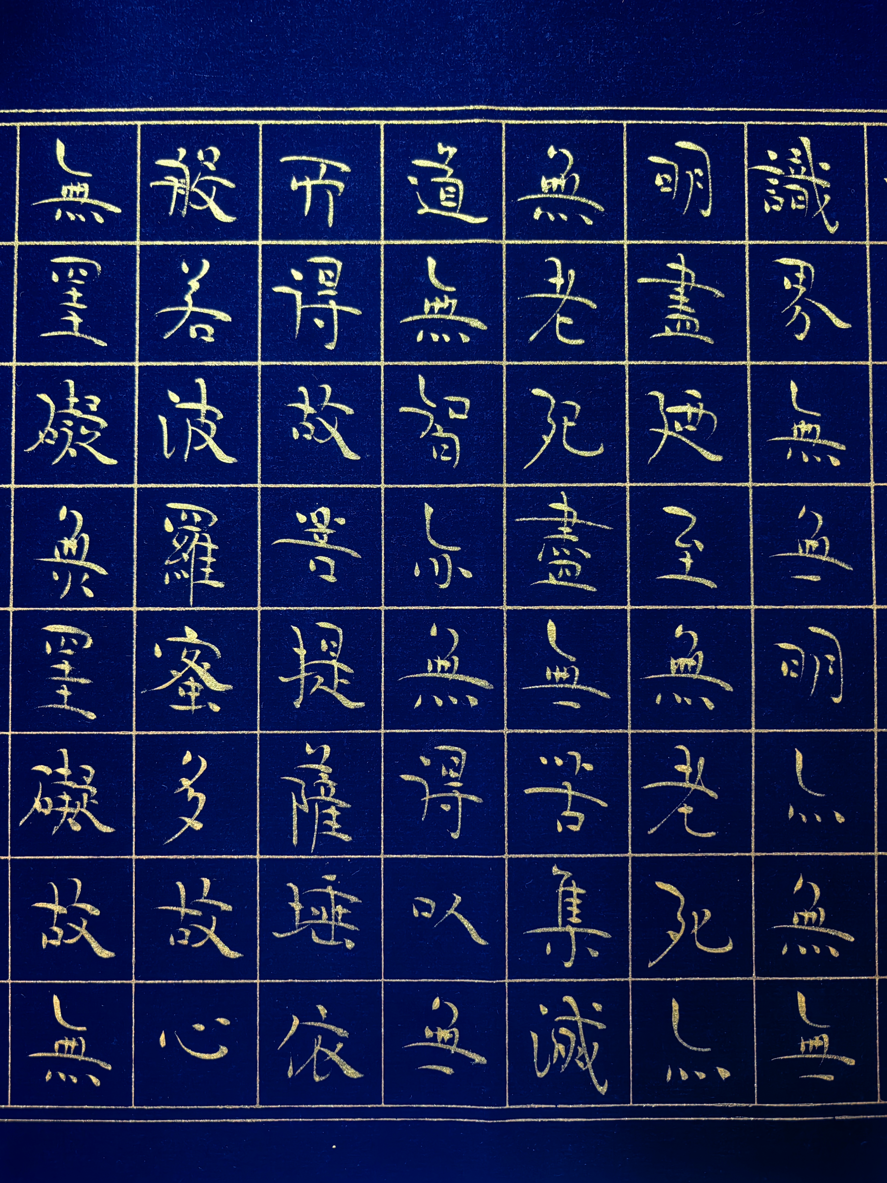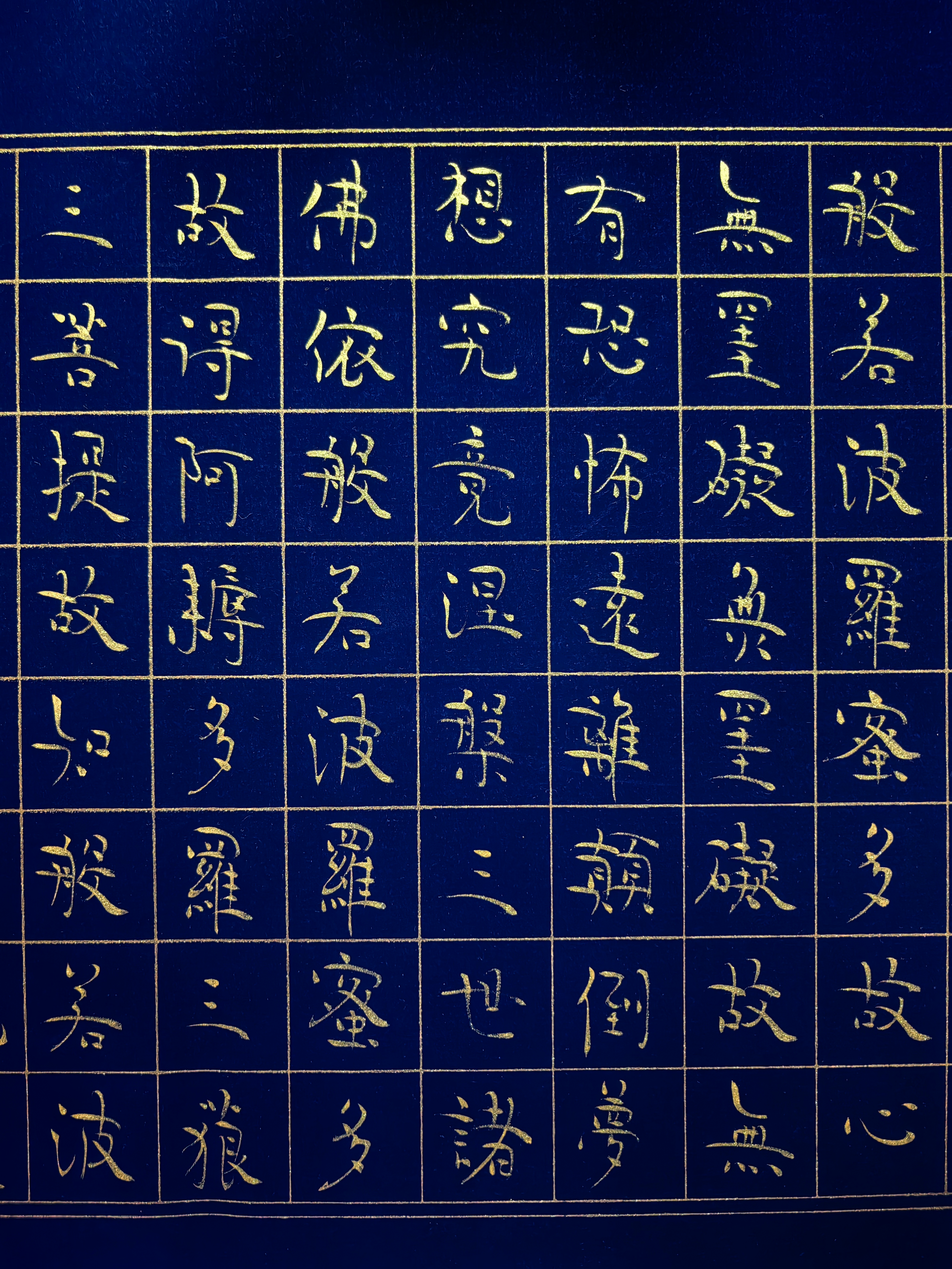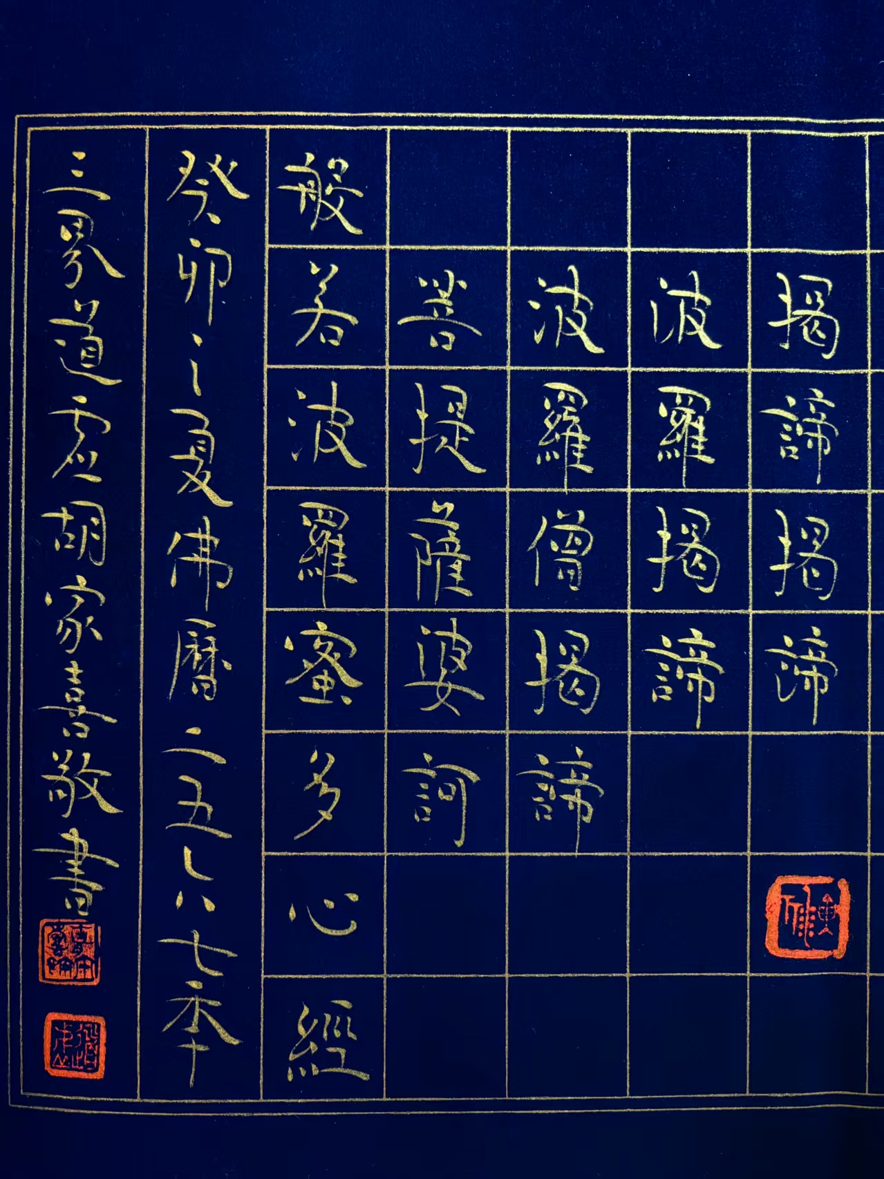 在北京一间充满文人气息的工作室内,胡家喜先生正悬腕运笔,深蓝方格笺上金墨流光。随着笔锋起落,《心经》经文如莲绽放,墨色凝香间禅意流淌——这幅作品,正是他独创“道虚体”书风的精妙呈现。