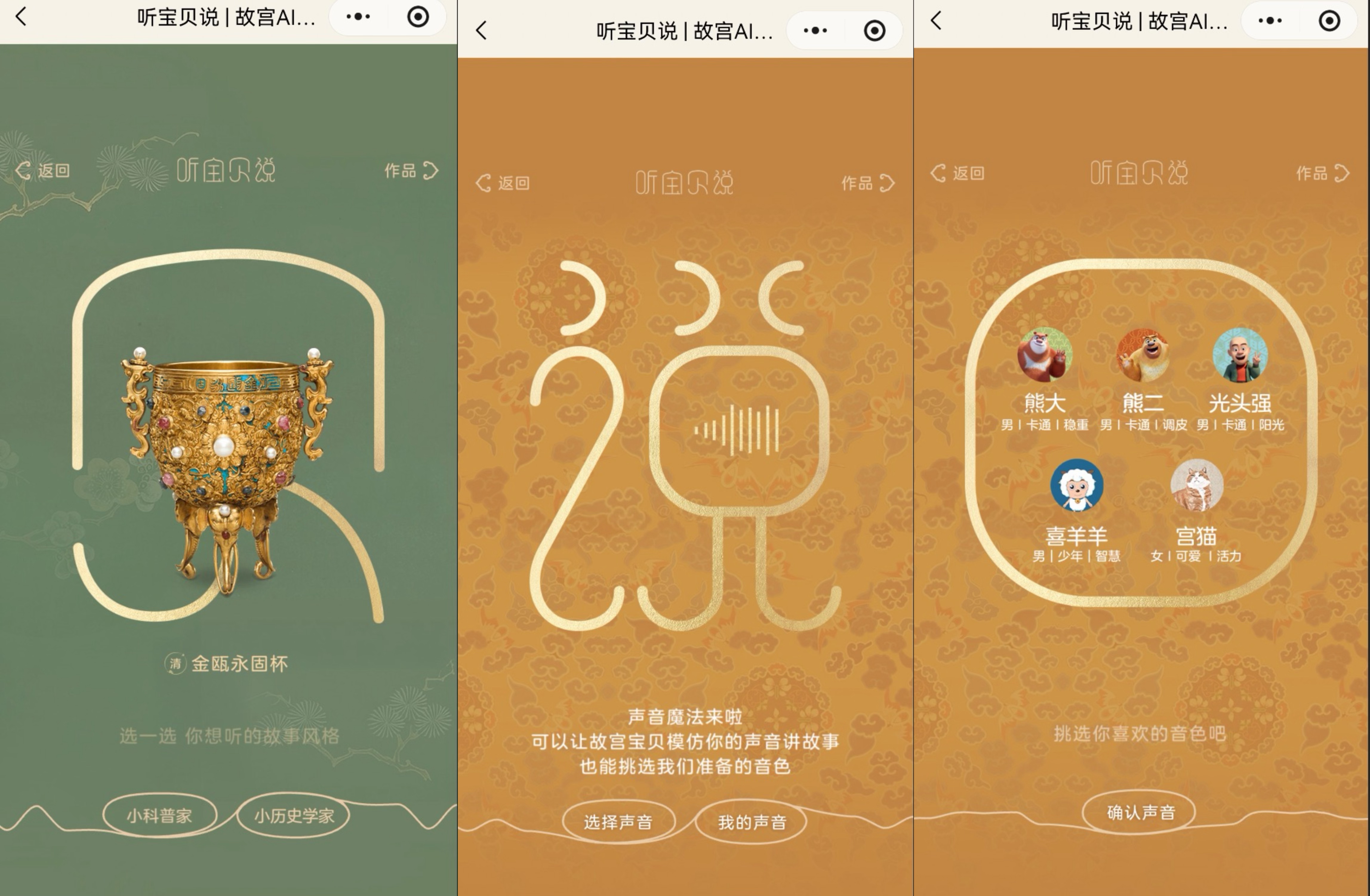 如果说《故宫宝贝团圆夜》是通过“看”来激发兴趣,那么双方在2025年底推出的“听宝贝说”AI互动播客,则旨在通过“听”与“说”来创造更深度的参与。它的玩法非常简单:用户进入“故宫博物院”微信小程序,从30件精选文物中挑选一件,自由选择扮演“小历史学家”或“小科普员”的不同人设,然后对着手机跟读一句话。紧接着,AI便能生成一段用用户本人声线讲述的文物故事播客。播客中还设置了喜羊羊、熊大、熊二、光头强、宫猫等动画角色的音色。